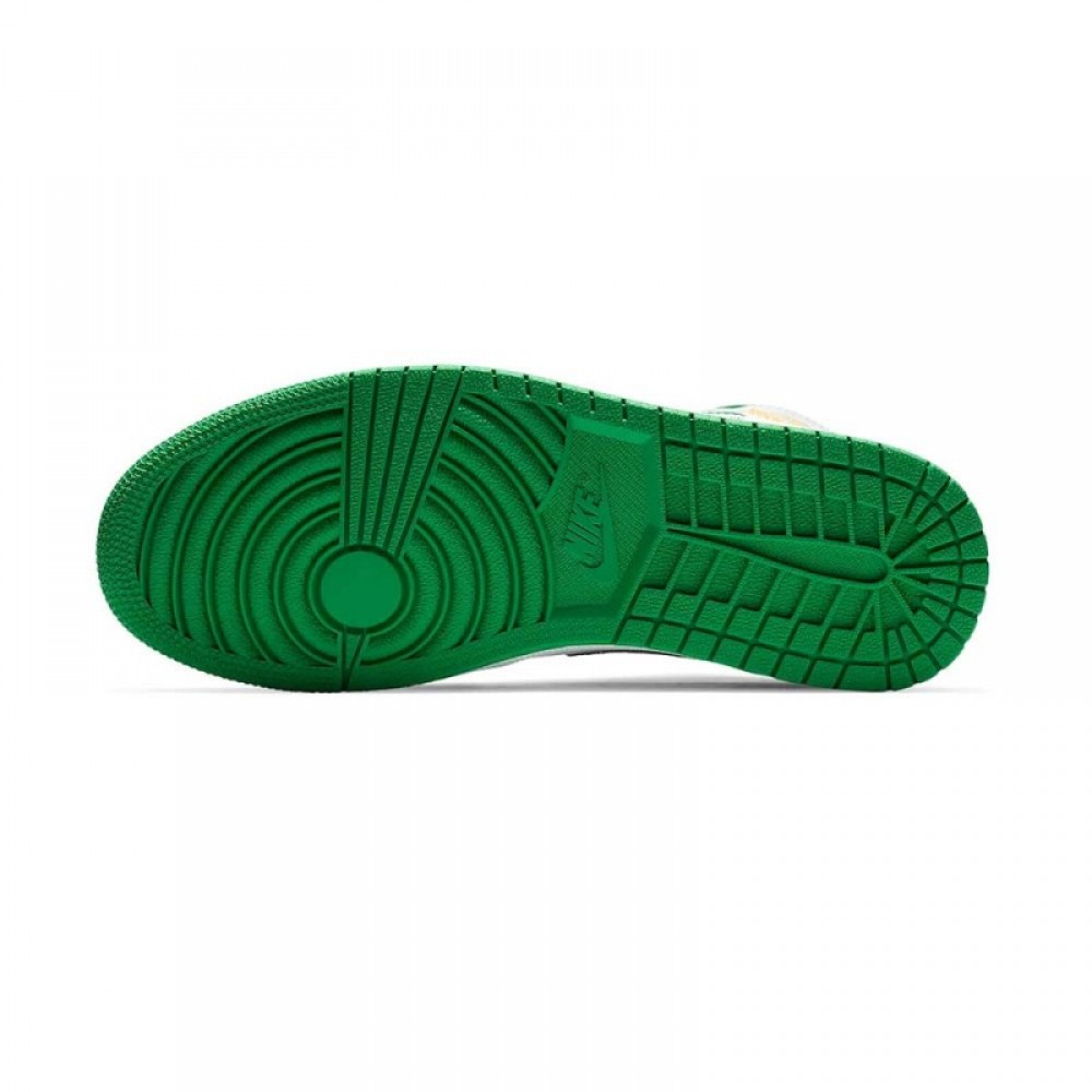 Looking closer this mid-top Air Jordan 1 comes with White leather across the upper while Black nylon lands on the Swoosh and overlays. Green is then used on the ankle and rubber outsole while Yellow is applied to the tongue branding and zig-zag stitching. Finishing the look is Orange on the Wings and wraps the heel.