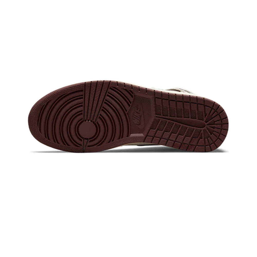 The Air Jordan 1 A Ma Maniére features a premium cracked leather upper with burgundy reptilian-textural leather collars and Swooshes. Silky quilted lining and custom woven tongue and insole labels add a sense of luxury. At the base, a yellowed sole provides a vintage feel to complete the design.