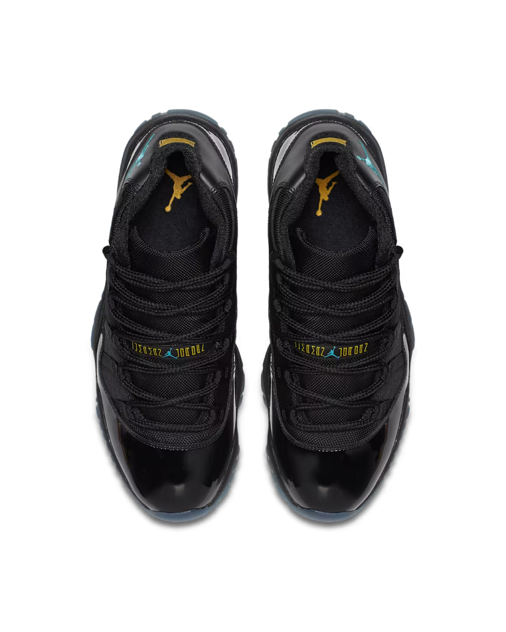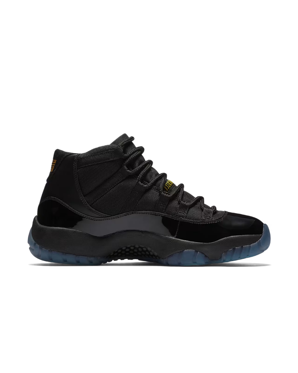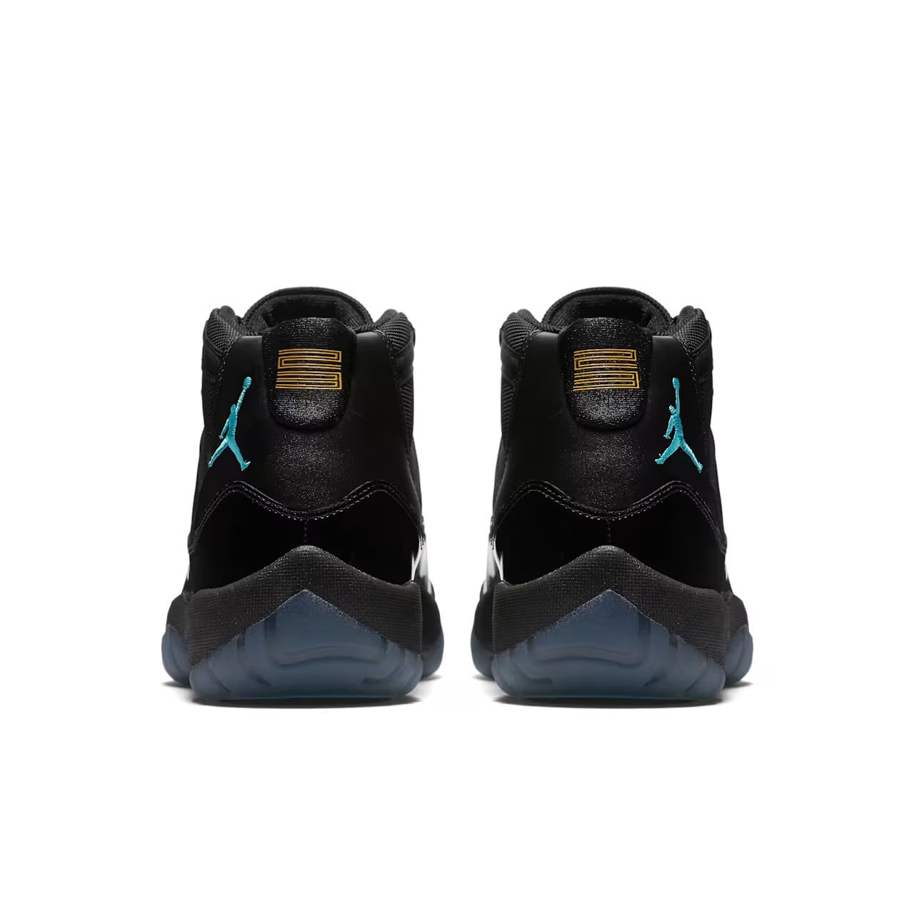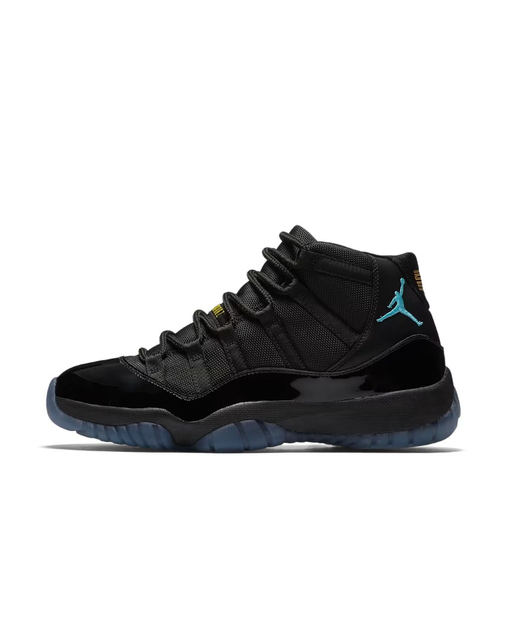 The 2025 iteration of the Air Jordan 11 ‘Gamma Blue’ shoes have a black ballistic mesh upper with a matching patent leather mudguard. The black leather heel panel showcases an embroidered Gamma Blue Jumpman logo, while a maize-colored ’23’ signoff appears on the back tab. These kicks have a black Phylon midsole carrying a full-length Nike Air unit. The blue-hued rubber outsole has herringbone traction pods and an exposed carbon fiber shank plate, providing steady traction and stability.