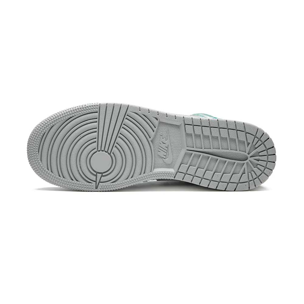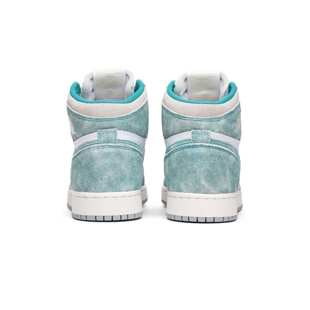 The Air Jordan 1 High GS “Turbo Green” is the kids’ grade school sizing for the popular colorway released in 2019. A distressed treatment was used on the leather of the upper to create a vintage effect, and the kids’ Jordan 1 has a teal and white color scheme with hints of purple and yellow to pay homage to the Charlotte Hornets, the NBA team that hosted the 2019 NBA All-Star Game. A cream midsole helps continue the vintage aesthetic, and each pair is completed with a grey outsole. The youth Air Jordan 1 High GS “Turbo Green” released on February 15, 2019.